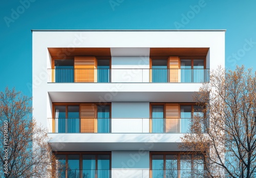 Modern Architectural Design of a Bright Apartment Building with Clean Lines and Large Windows Surrounded by Leafless Trees Against a Clear Sky