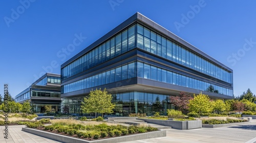 Modern Architectural Design of a Sleek Corporate Building Surrounded by Lush Landscaping and Clear Blue Skies on a Bright Sunny Day