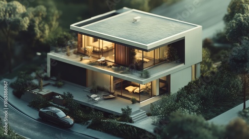 Modern architectural design of a stylish house with a pool and lush outdoor area, featuring clean lines and bright colors.