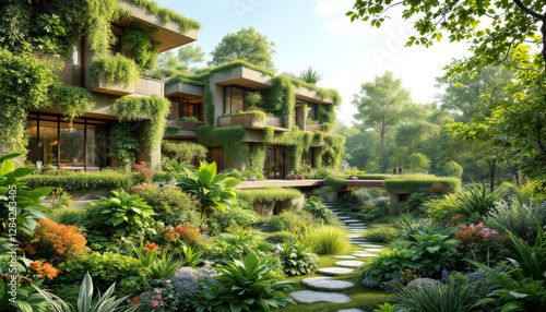 architecture, building, home, exterior, garden, plant, greenery, vegetation, nature, landscape, modern, design, house, ivy, facades, structure, urban, organic, sustainable, eco, friendly, green, environment, ecological, paseo, stone, pathway, bridge, tree, shrub, flower, foliage, balcony, window, wall, texture, light, shadow, summer, sunny, serene, peaceful, elegant, luxurious, lifestyle, contemporary, residence