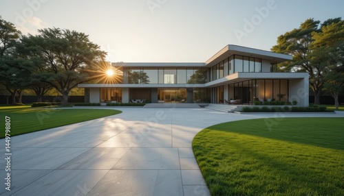 house, architecture, modern, home, building, estate, luxury, property, design, residential, real, sunset, evening, light, sun, ray, sky, grass, lawn, landscape, driveway, exterior, window, glasses, facades, contemporary, elegant, stylish, sophisticated, minimalist, clean, line, geometric, structure, tree, green, nature, landscaping