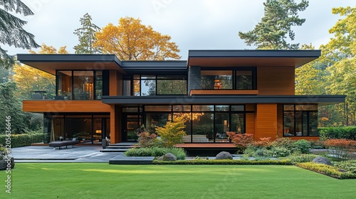 house, home, architecture, modern, luxury, residential, building, design, contemporary, estate, property, real, wood, autumn, tree, landscaping, garden, exterior, facades, window, grass, lawn, dream, fall, leaf, elegant, stylish, sophisticated, prestige, grand, scenic, peaceful, serene, tranquil, idylli, picturesque, suburban