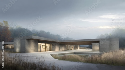 architecture, building, design, contemporary, nature, landscape, exterior, structure, concrete, minimalist, environment, fog, calmness, modernism, outdoors, road, pathway, tree, water, scenery, daylight, line, window, wall, artistic, grey, softness, peaceful, roomy, symmetry, element, green, rural, space, sky, sunlight, beauty, harmony, simplicity, detail, weather, morning, rural area