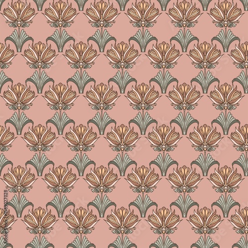 Modern, Art Deco, Art Nouveau. Seamless pattern of isolated graceful botanical elements, antique style for branding, advertising, wedding design. Digital illustration.