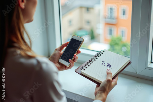 Modern Artistic Composition: Hands Holding Mobile Phone and Diary with To-Do List in Background