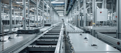 factory, production, line, conveyer, belt, automated, metal, grey, industrial, machinery, manufacturing, technology, modern, steel, structure, system, workflow, process, assembly, engineering, automation, logistic, efficiency, robotic, future, innovation, design, equipment, workshop, warehouse, facility, operation, interior, lighting, clean, bright