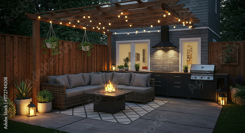 patio, backyard, modern, night, lighting, grill, pergola, relaxing, cosy, evening, landscape, design, furniture, wicker, stone, plant, landscaping, summer, entertainment, home, exterior, luxury, relaxation, ambience