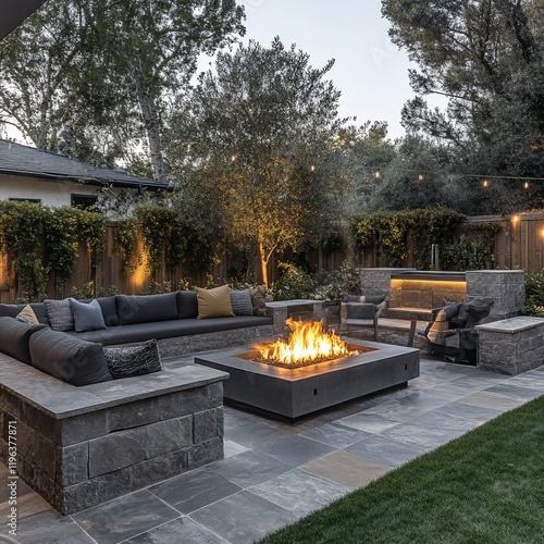 fire, pit, patio, backyard, furniture, sofa, sectional, modern, contemporary, design, landscape, garden, stone, wall, seating, area, relaxation, evening, night, light, warm, cosy, comfort, luxury, home, house, summer, spring, autumn, fall, winter, ambience, tranquil, serene, green, grass, plant, tree, illumination, fireplace, concrete, stylish, elegant, relaxing
