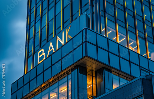bank, building, facades, modern, illuminated, twilight, architecture, contemporary, window, reflective, signage, finance, corporate, skyscraper, city, urban, glasses, light, dusk, evening, structure, banking, investment, economy, business, financial, district, blue, professional, exterior, commercial