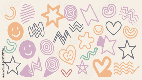 Modern Basic Shapes Set — Star, Arrow, Triangle, Circle, Heart, Zigzag, Spiral, and Wavy Lines. Trendy Memphis Geometric Pattern with a Cool Abstract Retro 80s, 90s Style. Fun and Cute Doodle Design f