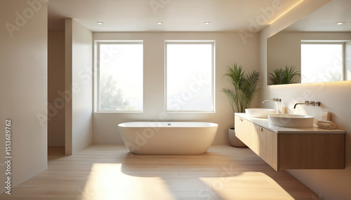 Modern bathroom interior with floating vanity stylish bathtub design. Light wooden floor with big windows. Minimalist aesthetic design, plants decor, neutral color, spacious spa inspired room.