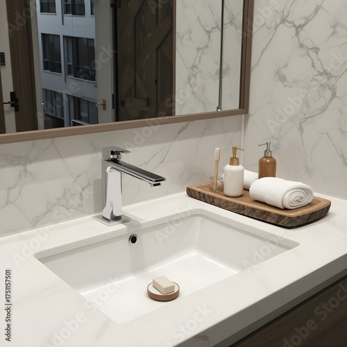 bathroom, sink, marble, modern, interior, design, toiletry, hygiene, wellness, clean, countertop, luxury, home, domestic, contemporary, faucet, mirror, white, spa, wood, tray, towel, soap, toothbrush, lifestyle, residential, real estate, elegant, plumbing, water, ceramic, washbasin, detail, closeup, healthy, fresh, new, renovation, decor, hotel, resort, commercial, nobody, horizontal, up close, stylish