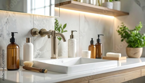 bathroom, sink, vanity, modern, clean, light, marble, plant, bottle, soap, faucet, white, wooden, decor, luxury, natural, organised, cleanliness, sophisticated, design