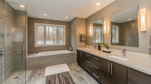 bathroom, modern, contemporary, sink, faucet, mirror, shower, bathtub, tile, floor tile, window, natural light, interior design, home decor, architecture, minimalist, clean, sleek, roomy