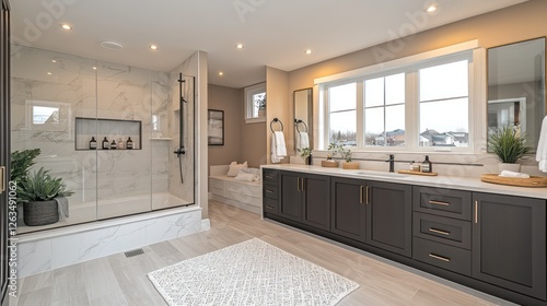 bathroom, modern, luxury, house, interior, design, vanity, tub, shower, home, elegant, soaking, double, view, window, clean, light, neutral, contemporary, marble, stone, wood, flooring, tile, decor, cabinet, kitchen, roomy, organised, cosy, plant, real, estate, property, renovation, construction, remodel, new, beautiful, fresh