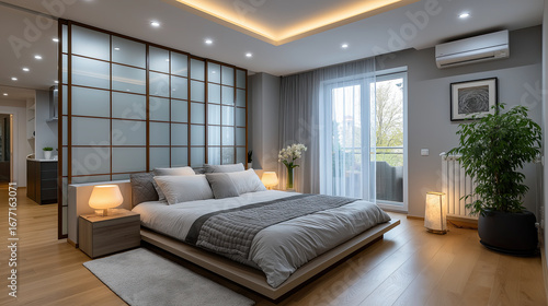 Modern bedroom design features spacious layout with large bed, soft lighting, and elegant decor, creating serene atmosphere