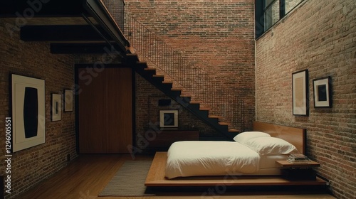 bedchamber, interior, design, architecture, modern, minimalism, wood, brick, staircase, decor, furniture, lighting, artwork, textile, relaxation, comfort, space, aesthetic, contemporary, warm, element, natural, cosy, stylish, home, residential, atmosphere, arrangement, simplicity, living, unique, elegant, bed, wall, floor, layout, calmness, tone, ambience, structure, environment, inviting, attracted, setting, visual, craftsmanship, detail, quality