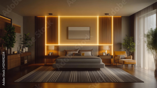 Modern bedroom design with geometric striped rug, warm lighting, and stylish furniture creates cozy atmosphere. Perfect for relaxation and comfort