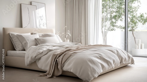 bedchamber, modern, cosy, bed, linen, natural, light, window, decor, minimalist, furniture, interior, design, white, curtain, relaxing, space, comfort, styling, calmness, home, aesthetic, peaceful, ambience, architecture, textile, cushion, plant, greenery, wall, art, room, simplicity, bright, lifestyle, sleep, atmosphere, contemporary, elegance, bedding, planning, relaxation, detail, arrangement, material, serene, environment, generative, ai