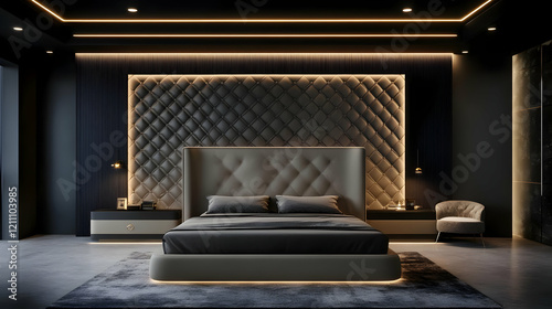 Modern Bedroom Interior Design Showcases a Luxurious Bed with Ambient Lighting and Tufted Wall Panels.