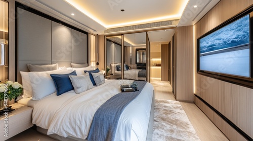 bedchamber, interior design, modern, contemporary, luxurious, elegant, comfortable, cosy, white, grey, blue, wood, floor, carpet, bed, pillow, headboard, bedside table, lamp, television, decor, style, minimalist, roomy, bright, light, home, house, apartment, living, design, architecture, furniture, soft, smooth, clean, fresh, relaxed, peaceful, calm, tranquil, serene, sophisticated, inviting