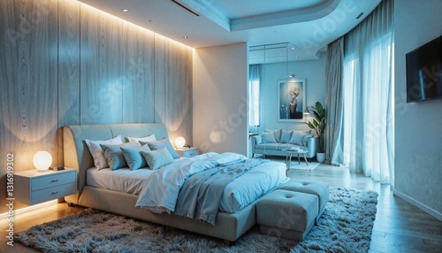 bedchamber, modern, interior, decor, cosy, lighting, furniture, design, comfort, stylish, soft, relaxation, home, contemporary, minimalistic, clean, ambience, calmness, aesthetic, room, plush, curtain, natural light, artwork, rug, plant, wooden, roomy, inviting, calm, residential, luxury, sleep, architecture, blue, pastel, chic, peaceful, warm, lifestyle, home decor, indoor, soothing, pristine, elegant