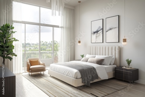 Modern bedroom minimalist design soft neutral colors, floor-to-ceiling windows with sheer curtains