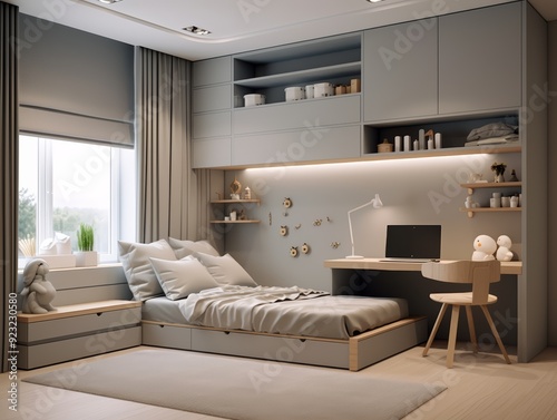 bedchamber, bed, furniture, decor, interior, design, modern, contemporary, minimalist, style, home, house, room, space, light, window, wall, shelf, desk, chair, wood, grey, white, beige, carpet, floor, lamp, laptop, storage, comfortable, cosy, simple, elegant, peaceful, calm, living