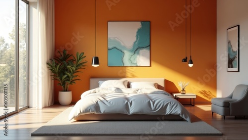natural, furniture, white, bed, modern, wall, linen, elegant, orange, interior, room, decor, plant, peaceful, abstract, warm, clean, simple, space, design, calm, bedchamber, sunlight, stylish, artwork, comfortable, home, contemporary, light, minimalist, cosy, living, art