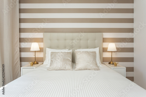Modern bedroom with pillows and a bed for tourists. Frontally.