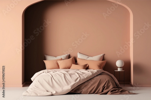 Modern bedrroom with monochrome neutral beige empty wall. Contemporary interior design with trendy wall color, bed, pillows and arch. Generative AI.