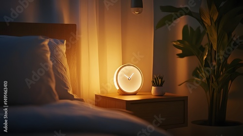 Modern bedside alarm clock glowing softly in warm early morning bedroom.