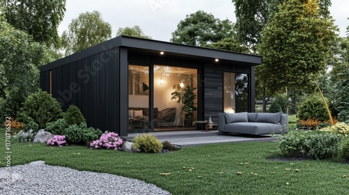 Modern Black Cottage Surrounded by Lush Greenery and Colorful Flowers