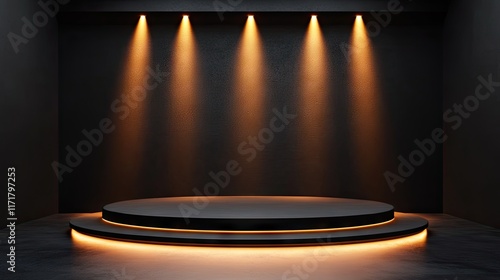 Modern black stage setup with golden spotlights illuminating a sleek central podium, perfect for events.