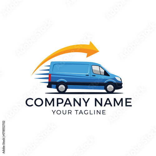 Modern Blue Delivery Van Logo with Yellow Arrow and Speed Lines on White Background for Fast Logistics and Transportation Services Branding, Flat Vector Elements, Vector Illustration, Simple Vector,