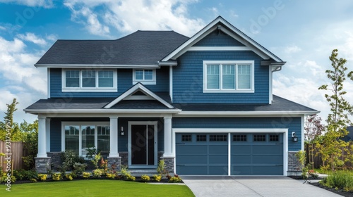 house, home, architecture, residential, exterior, modern, style, blue, garage, door, window, lawn, grass, garden, landscape, suburb, property, real, estate, building, structure, roof, brick, stone, front, yard, sidewalk, driveway, white, sky, cloud, fence, tree, green, design, colours, facades, contemporary, dream, family, luxury, elegant