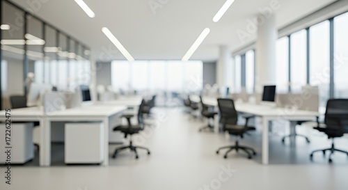Modern blurred office interior with desks, chairs, and computers. Bright daylight through large glass windows creates a clean, minimal, and professional work environment with a soft focus aesthetic.