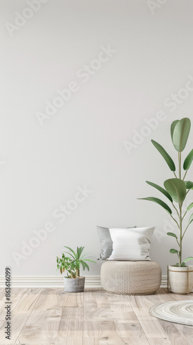 Modern boho interiors in neutral color with minimal furniture decor, copy space and natural lighting. Residential contemporary space for Real Estate advertising.