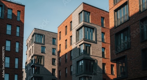building, architecture, modern, brick, apartment, residential, urban, exterior, sunlight, golden hour, warm, light, shadow, geometric, contemporary, facades, window, sky, daytime, outdoors, housing, structure, design, city, property, real estate, minimalist, clean, angular, perspective, residential area