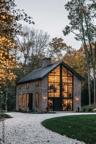 modern, house, brick, architecture, large, window, evening, light, autumn, foliage, timberland, setting, lighting, cosy, atmosphere, contemporary, design, serene, environment, warm, glow, nature, peaceful, retreat, driveway, greenery, home, exterior, rustic, charme, seasonal, scenery, architectural, beauty, surrounding, tree, ambience, landscape, glasses, facades, residential, property, reflections, tranquil, space, garden, illuminated, country
