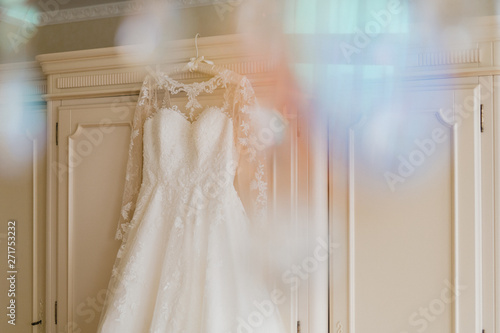 Modern bridal fashion. White wedding dress hanging in the hotel room.