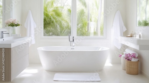 bathroom, modern, bright, white, tub, soaking, view, window, plant, luxury, spa, clean, minimalist, elegant, fresh, cleanliness, design, decor, interior, home, house, style, contemporary, neutral, minimal, simple, vanity, sink, faucet, towel, flower, peaceful, relaxing, organised, lighting, natural, comfortable, sanitary, refreshing, beautiful