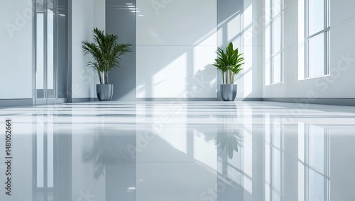 modern, bright, minimalist, office, hallway, interior, design, contemporary, clean, roomy, sleek, light, airy, neutral, grey, white, plant, potted, polished, reflective, floor, window, sunlight, empty, corridor, commercial, professional, simple, elegant, modernist, architecture, rendering, empty space, smooth, modern architecture, urban, business, functional, efficient, serene, peaceful