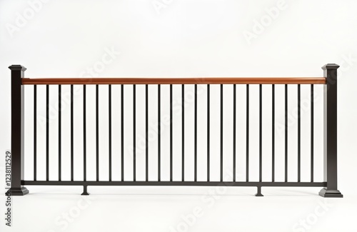 Modern brown steel railing with wooden handrail. Safety design for balcony staircase. Strong construction materials. Stylish home outdoor structure. Ideal for residential commercial projects.