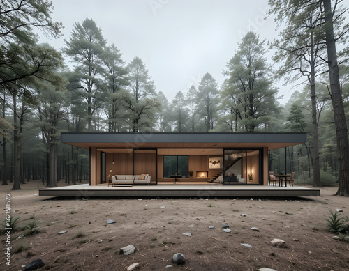 Modern Cabin in Misty Pine Forest