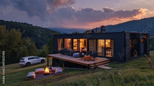 cabin, house, modern, home, architecture, mountain, mountain, hill, hill, forest, tree, wood, sky, sunset, evening, night, grass, field, lawn, rural, nature, landscape, exterior, design, minimalist, building, structure, contemporary, residential, property, real, estate, fire, campfire, pit, car, suv, vehicle, deck, patio, window, glasses, view, silhouette, peaceful, serene, tranquil, calm