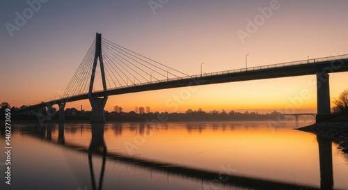 bridge, cable, sunrise, river, sunset, city, skyline, landscape, morning, calm, water, nature, light, architecture, urban, travel, scenic, gold, tranquil, scenery, city landscape, structure, modern, transportation, design, steel, cable, river bank, infrastructure, view, calmness, peaceful, dawn, exterior, road, highway, daylight, illumination, quiet, silhouette, grey, orange, yellow