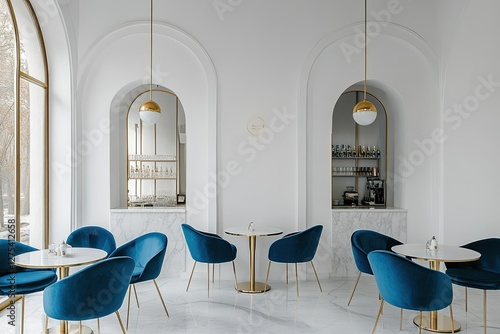 Modern cafe interior with arched windows and blue velvet chairs