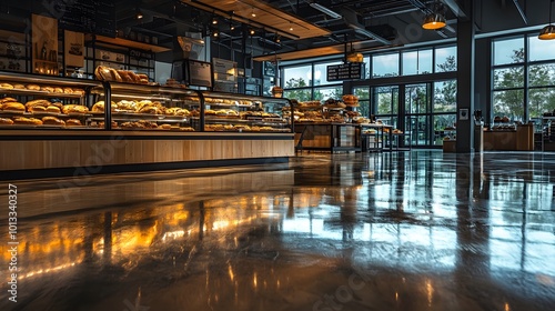 modern cafe interior with bakery display