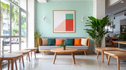 Modern cafe interior with comfortable seating and pops of color